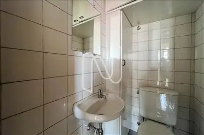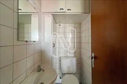 Possui banheiro privativo, já com espelho, armário e tampa de vaso instalados.